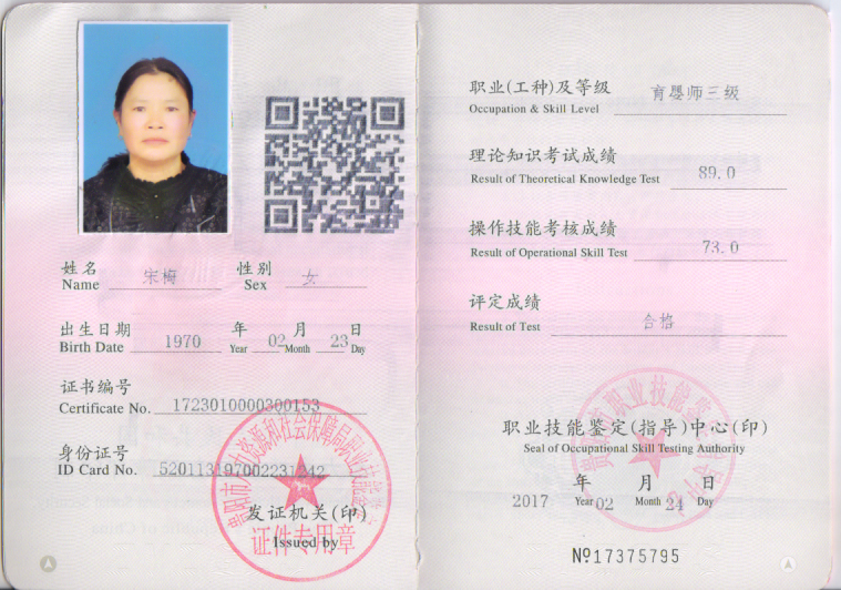 级别:初级月嫂/中级育婴师 证书:高级育婴师