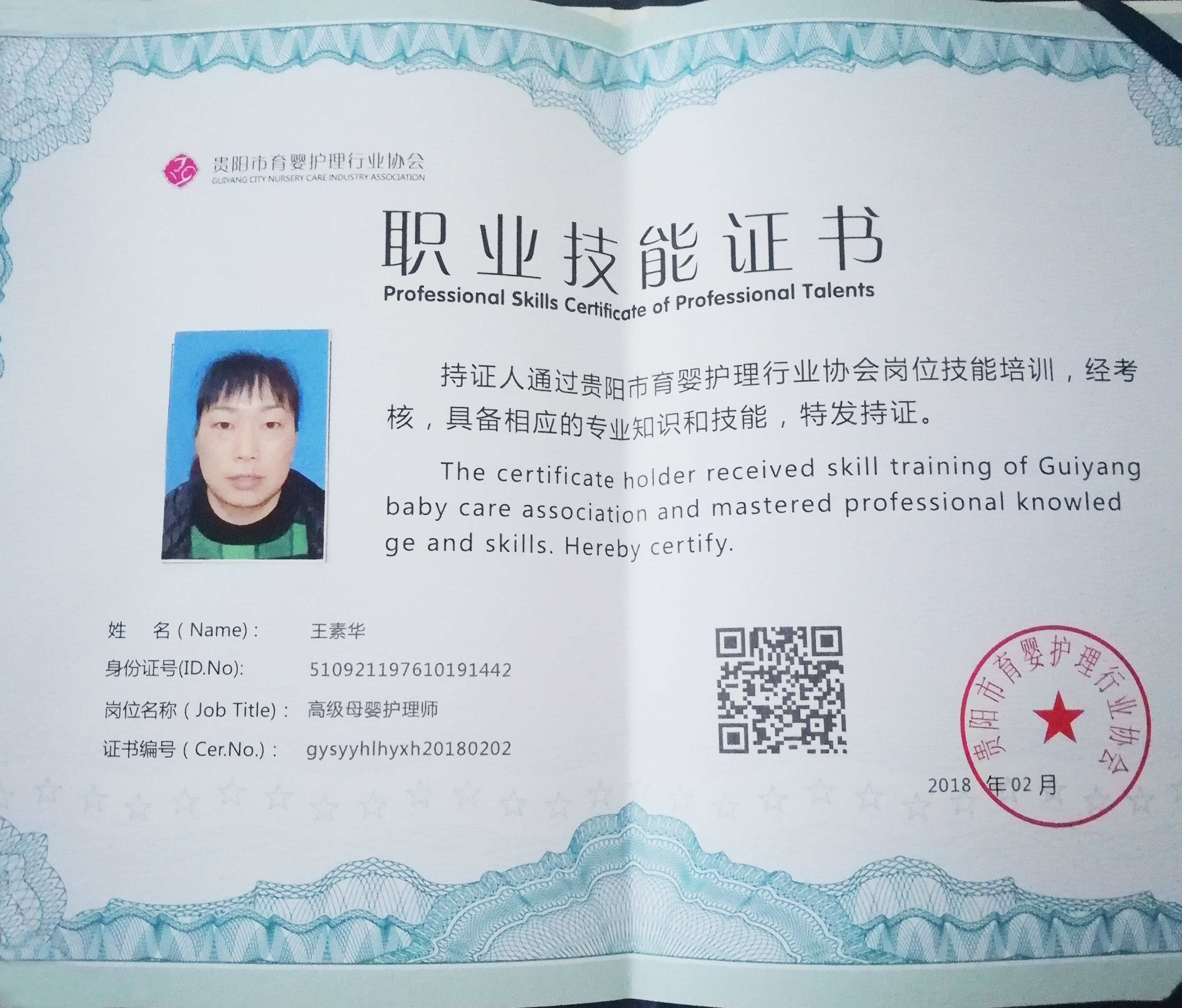 级别:高级育婴师/初级月嫂 证书:高级母婴护理师