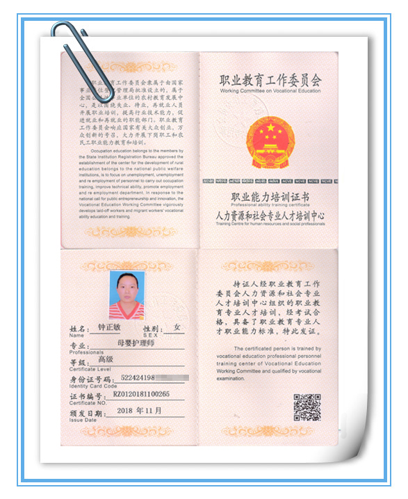 级别:初级育婴师/初级月嫂 证书:高级母婴护理