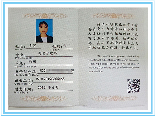 级别:初级月嫂/初级育婴师 证书:高级母婴护理师