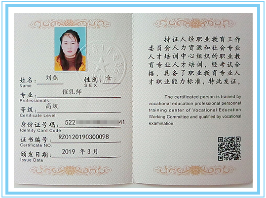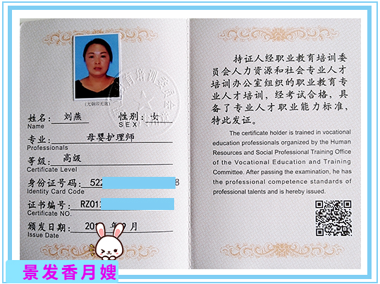 级别:高级育婴师/高级月嫂 证书:高级母婴保健师证