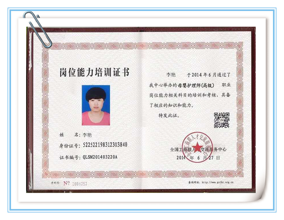 级别:中级月嫂/高级育婴师 证书:高级母婴护理师